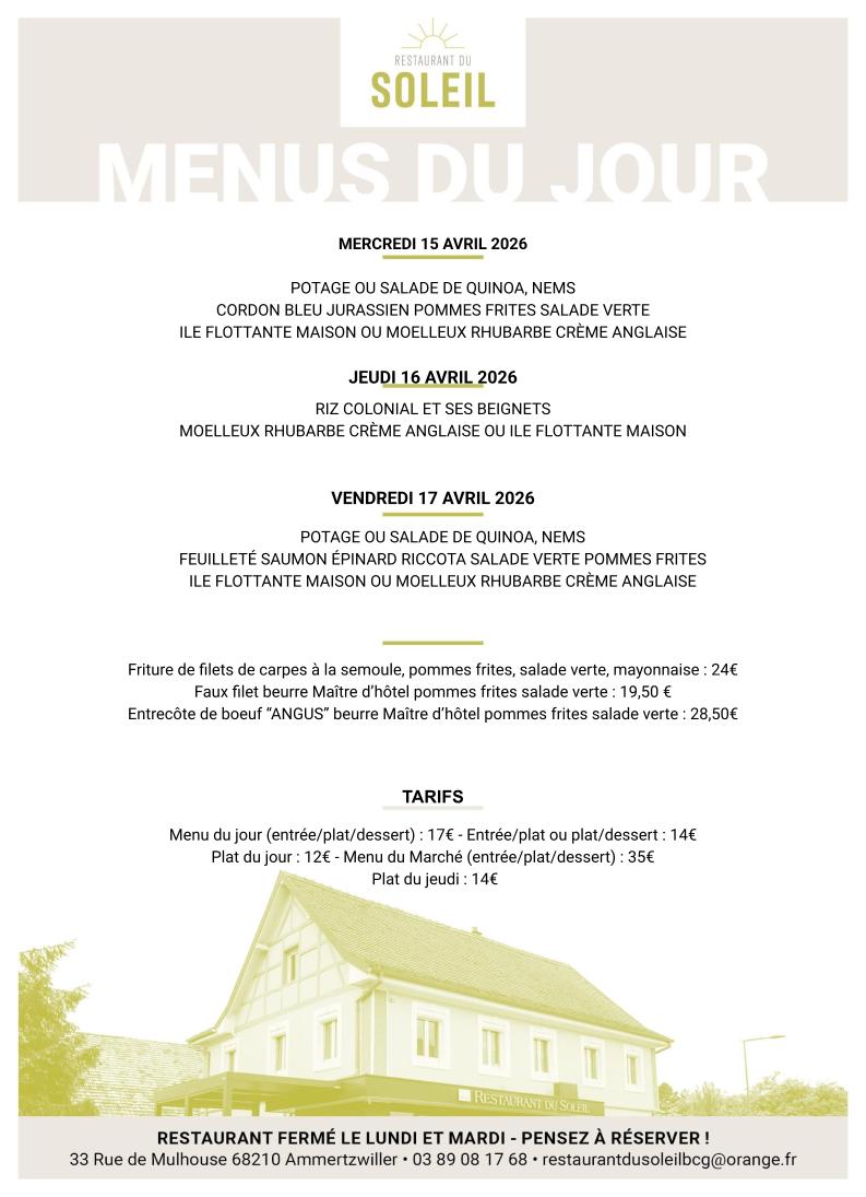 LE RESTAURANT DU SOLEIL SERA FERMÉ DU VENDREDI SOIR 17 AVRIL AU MARDI 28 AVRIL 2026 INCLUS